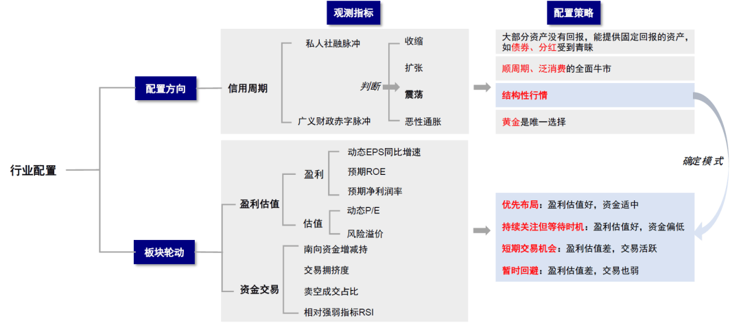 整体上,根据信用周期选择方向。我们使用以下指标观测信用周期:1)广义财政赤字脉冲:衡量政府信用扩张,用广义财政赤字同比变化占GDP比重测算;2)私人部门社融脉冲:衡量私人信用扩张,用私人部门新增社融同比变化占GDP比重测算,反映实体融资需求和信贷投放强度。根据信用扩张的不同阶段,实行不同的配置策略:1)当信用周期收缩(意味着大部分资产没有回报),能提供固定回报的资产如债券和分红会受到青睐;2)若信用周期整体修复,则体现为顺周期和泛消费的全面牛市;3)极端情况下若连固定回报资产都被恶性通胀所侵蚀,那么只剩下黄金是唯一选择;4)当信用周期局部修复时,则会体现为结构型行情。