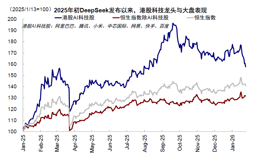 2026-02-13球速体育,球速体育官方网站,球速体育APP下载1月中旬A股逐步“降温”后,南向转为更多关注港股,再加上新消费、有色和互联网的催化,共同推动港股的一波走高。但随后,全球贵金属动荡、市场对美联储的担忧,中美科技龙头“逆风”,使得港股承受了来自风险偏好、流动性和结构上的三重压力。2月以来,恒生指数下跌3%(vs. 上证指数和标普500小幅下跌1.3%和0.1%),恒生科技下跌6.5%(vs. 科创50和纳斯达克下跌5.8%和1.8%),跌至去年7月以来新低,自10月高点回撤接近20%。